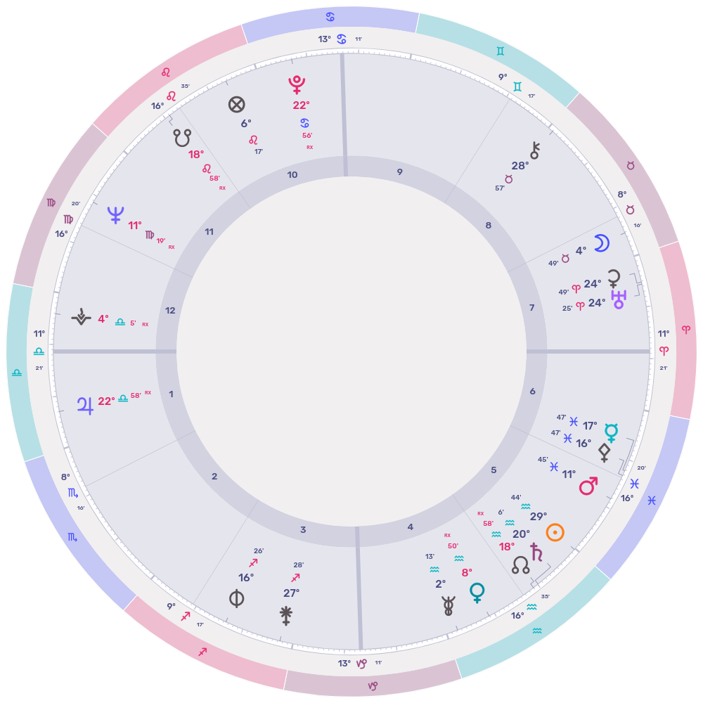 Overall, I think Lorde’s natal chart is a great one to look into to parse out the nuances of technically difficult placements, or very mixed planetary condition. It figures that her chart wouldn’t look easy-peasy because her life included significant struggle as a marginalised person. But I also do see testimony to her strength of character and the beauty of her contributions; and I find the interplay between Venus as chart ruler from a tight spot, and the exalted Moon in the 8th House of shared resources ruling the MC, fascinating in that regard7.