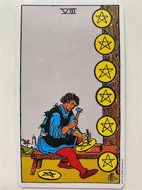 Virgo I is associated to the minor arcana of the 8 of Pentacles in the Tarot; in the Rider-Waite-Smith Tarot, we can see someone working to carve Pentacles, diligent and focused. Ryberg describes it as someone honing their skills by putting in the time and effort necessary to reap the rewards.