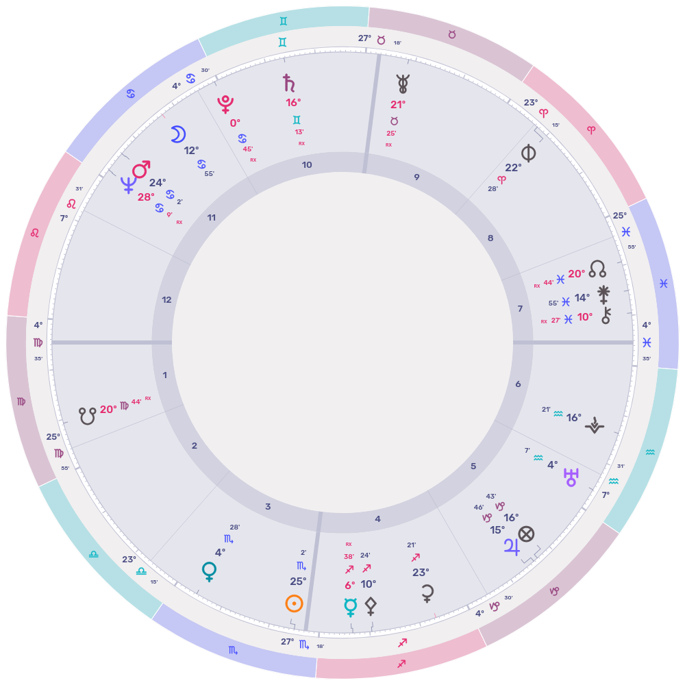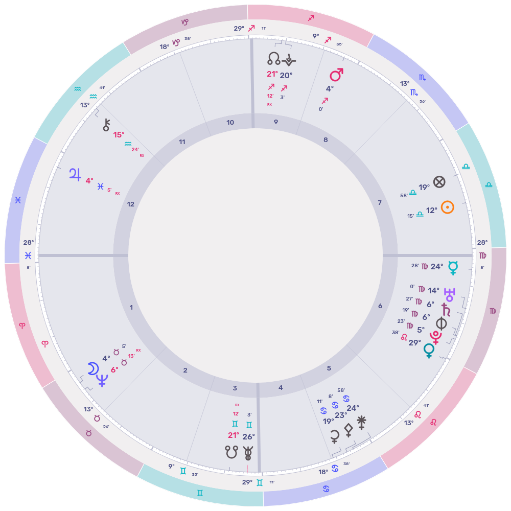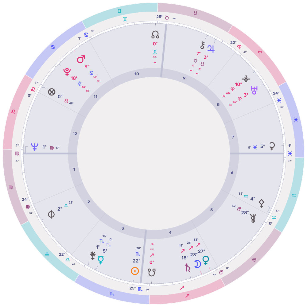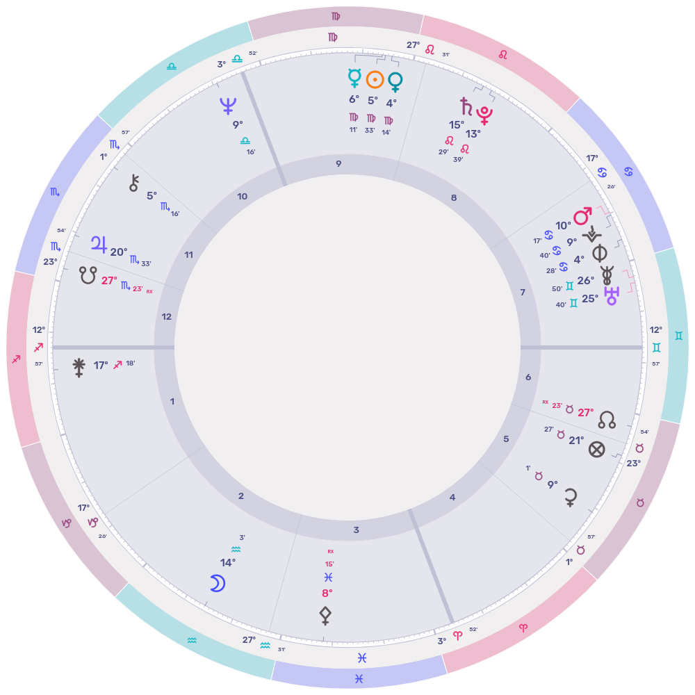 I find it particularly interesting to see this specific trio here, angular in Virgo I, given Grandin’s line of work and interests: she has written quite a lot about ways of seeing the world but also what she calls visual thinking, for instance in Visual Thinking: The Hidden Gifts of People Who Think in Pictures, Patterns, and Abstractions, published in 2022. Mercury is associated with communication, speech and learning, the Sun with visibility and the eyes, and Venus with beauty, unification, diplomacy!